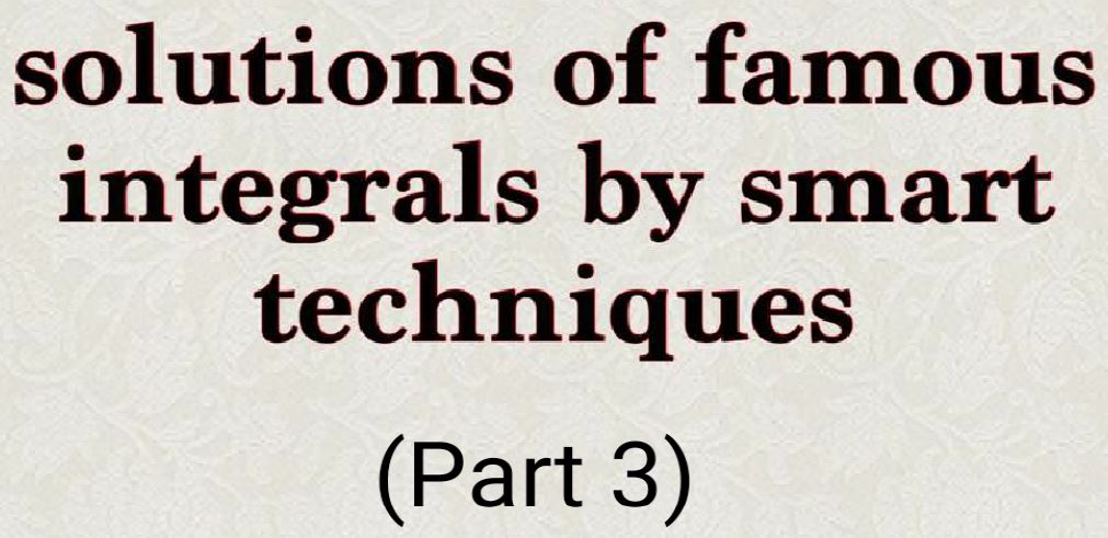 SOLUTIONS OF FAMOUS INTEGRALS BY SMART TECHNIQUES-PART 3 Posted on July 27, 2017 by ssmrmh MathNote by Nawar Alasadi-Babylon-Iraq SOLUTIONS OF FAMOUS INTEGRALS BY SMART TECHNIQUES -3.compressed