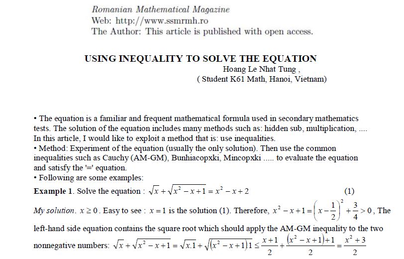 USING INEQUALITY TO SOLVE THE EQUATION Posted on May 30, 2018 by ssmrmh Math Note by Hoang Le Nhat Tung-Hanoi-Vietnam USING INEQUALITY TO SOLVE THE EQUATION