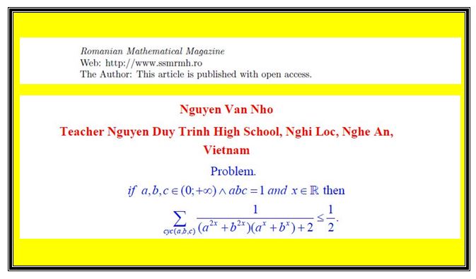 A NICE INEQUALITY BY NGUYEN VAN NHO-4 Posted on September 5, 2018 by ssmrmh Proposed by Nguyen Van Nho-Nghe An-Vietnam A NICE INEQUALITY BY NGUYEN VAN NHO-4 Solution by proposer