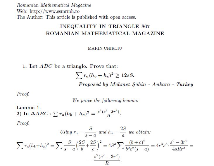 COMMENTED PROBLEM-58 Posted on November 2, 2018 by ssmrmh Math Note by Marin Chirciu-Romania COMMENTED PROBLEM 58