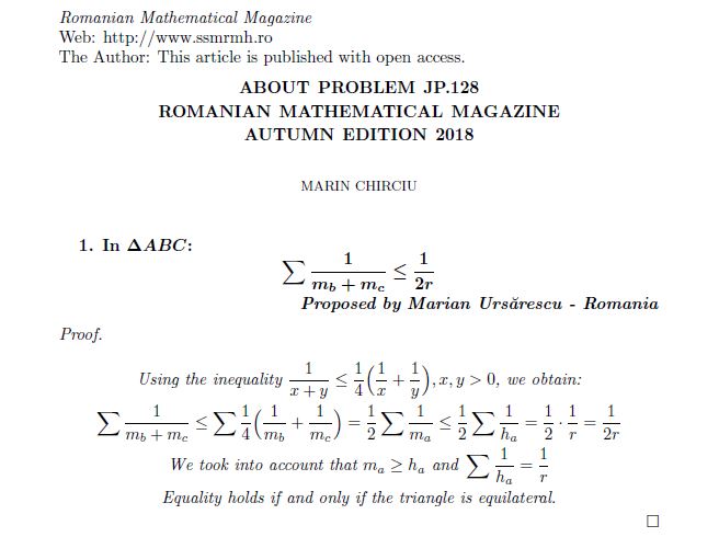 COMMENTED PROBLEM-70 Posted on December 27, 2018 by ssmrmh Math Note by Marin Chirciu-Romania COMMENTED PROBLEM 70