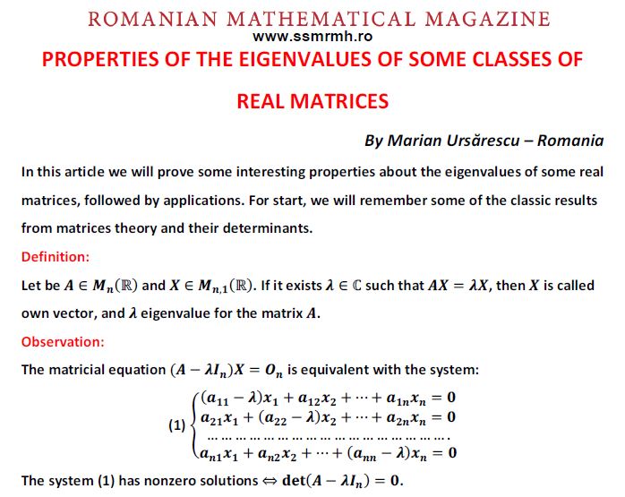 PROPERTIES OF THE EIGENVALUES OF SOME CLASSES OF REAL MATRICES Posted on April 14, 2019 by ssmrmh Article by Marian Ursarescu-Romania PROPERTIES OF THE EIGENVALUES OF SOME CLASSES OF REAL MATRICES
