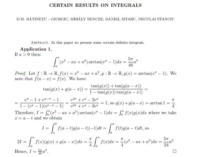 CERTAIN RESULTS ON INTEGRALS Posted on April 17, 2019 by ssmrmh Article by D.M.Batinetu-Giurgiu, Mihaly Bencze, Daniel Sitaru, Neculai Stanciu-Romania CERTAIN RESULTS ON INTEGRALS