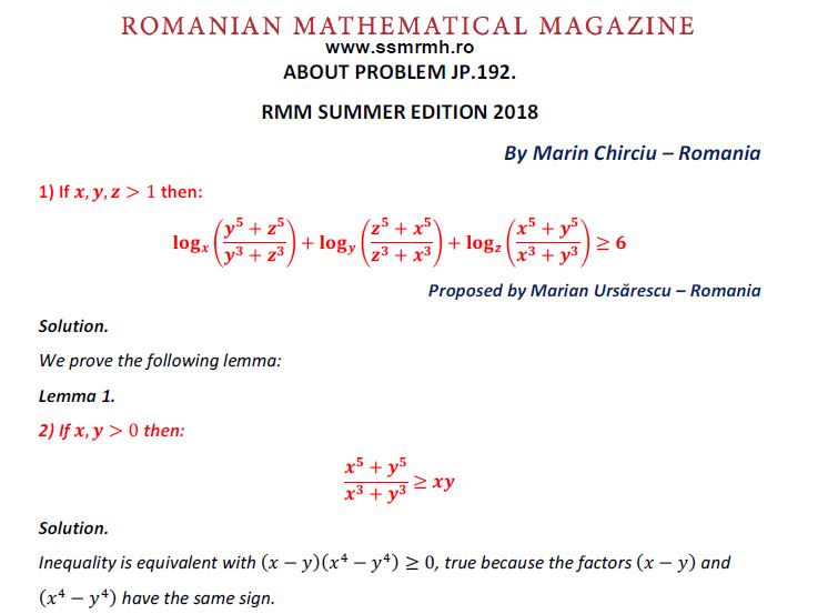 ABOUT PROBLEM JP192-RMM SUMMER EDITION 2018 Posted on May 28, 2019 by ssmrmh MathNote by Marin Chirciu-Romania ABOUT PROBLEM JP192-RMM SUMMER EDITION 2018