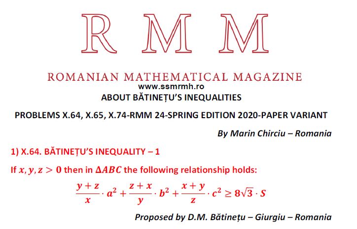 ABOUT BATINETU’S INEQUALITIES Posted on July 31, 2019 by ssmrmh Article by Marin Chirciu-Romania ABOUT BATINETU’S INEQUALITIES