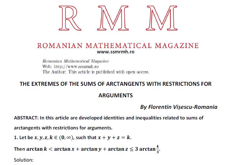 THE EXTREMES OF THE SUMS OF ARCTANGENTS WITH RESTRICTIONS FOR ARGUMENTS Posted on October 23, 2019 by ssmrmh Article by Florentin Visescu-Romania THE EXTREMES OF THE SUMS OF ARCTANGENTS WITH RESTRICTIONS FOR ARGUMENTS