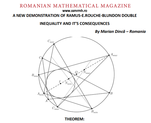 A NEW PROOF OF RAMUS E.ROUCHE-BLUNDON DOUBLE INEQUALITY Posted on October 26, 2019January 15, 2020 by ssmrmh Article by Marian Dinca-Romania Figure belongs to Catalin Barbu-Romania A NEW PROOF OF RAMUS E.-ROUCHE&BLUNDON DOUBLE INEQUALITY