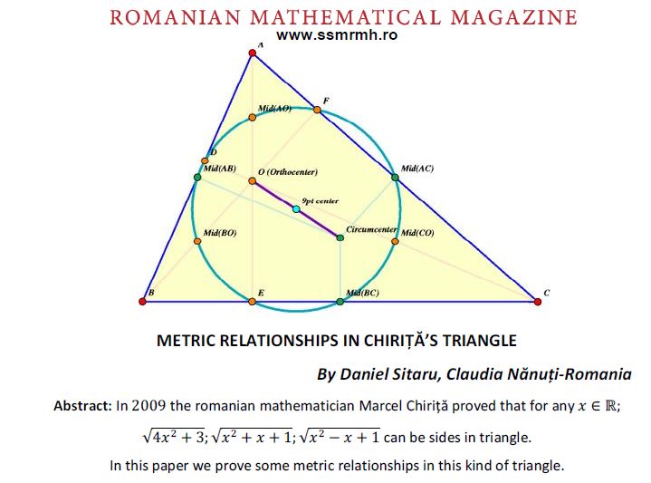 METRIC RELATIONSHIPS IN CHIRITA’S TRIANGLE Posted on November 6, 2019 by ssmrmh Article by Daniel Sitaru, Claudia Nanuti-Romania METRIC RELATIONSHIPS IN CHIRITA’S TRIANGLE