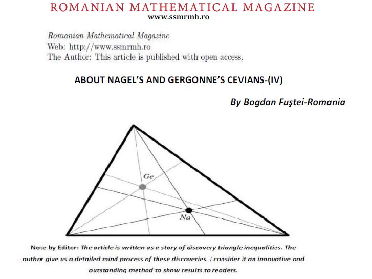 ABOUT NAGEL’S AND GERGONNE’S CEVIANS-(IV) Posted on February 19, 2020 by ssmrmh Math Note by Bogdan Fustei-Romania ABOUT NAGEL’S AND GERGONNE’S CEVIANS-_IV_