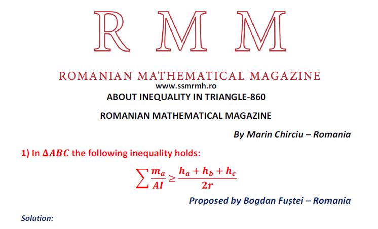 ABOUT INEQUALITY IN TRIANGLE-860 Posted on February 21, 2020 by ssmrmh Math Note by Marin Chirciu-Romania ABOUT INEQUALITY IN TRIANGLE-860