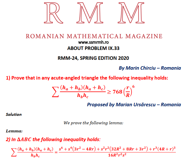 ABOUT PROBLEM IX33-RMM 24 Posted on March 4, 2020 by ssmrmh Math Note by Marin Chirciu-Romania ABOUT PROBLEM IX33-RMM24