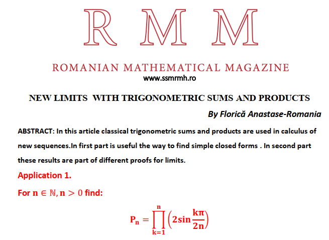 NEW LIMITS WITH TRIGONOMETRIC SUMS AND PRODUCTS Posted on April 26, 2020May 6, 2020 by ssmrmh Article by Florica Anastase-Romania NEW LIMITS WITH TRIGONOMETRIC SUMS AND PRODUCTS