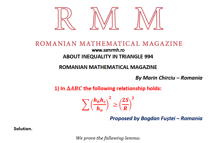 ABOUT INEQUALITY IN TRIANGLE-994 Posted on May 14, 2020May 14, 2020 by ssmrmh Math Note by Marin Chirciu-Romania ABOUT INEQUALITY IN TRIANGLE 994