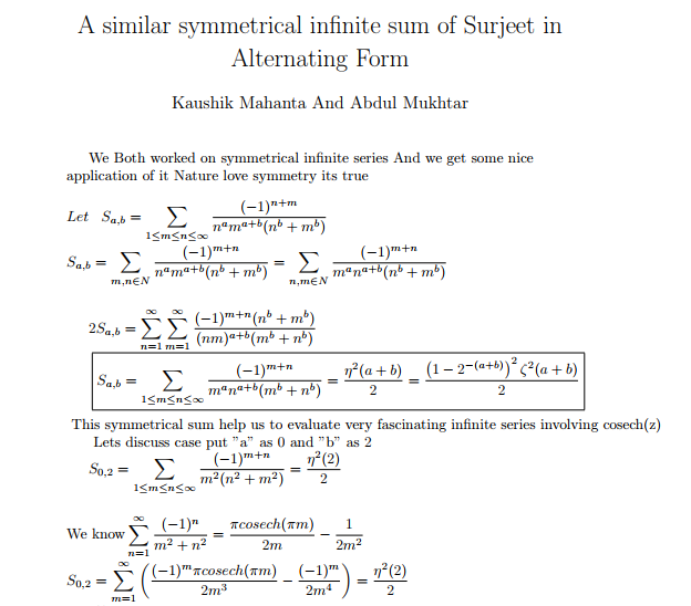 NEW SYMMETRICAL INFINITE ALTERNATING SUMS Posted on May 23, 2020 by ssmrmh Math Note by Kaushik Mahanta-India, Abdul Mukhtar-Nigeria NEW SYMMETRICAL INFINITE SUMS