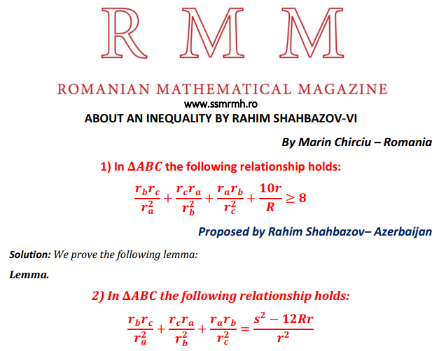 ABOUT AN INEQUALITY BY RAHIM SHAHBAZOV-VI Posted on June 25, 2020 by ssmrmh Math Note by Marin Chirciu-Romania ABOUT AN INEQUALITY BY RAHIM SHAHBAZOV-VI