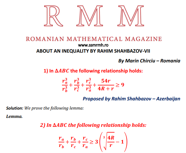 ABOUT AN INEQUALITY BY RAHIM SHAHBAZOV-VII Posted on June 25, 2020 by ssmrmh Math Note by Marin Chirciu-Romania ABOUT AN INEQUALITY BY RAHIM SHAHBAZOV-VII