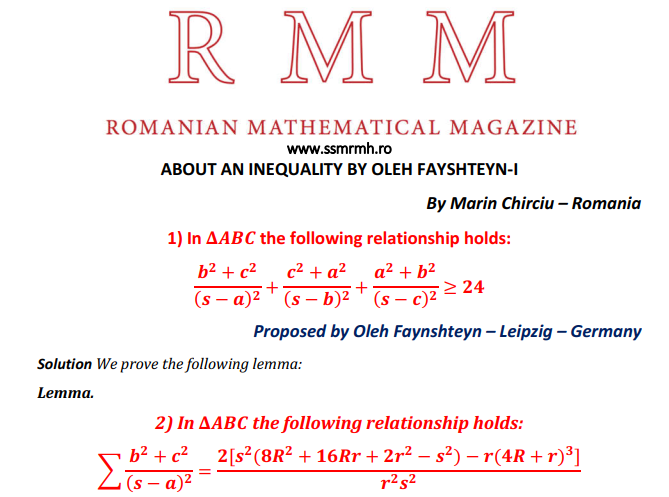 ABOUT AN INEQUALITY BY OLEH FAYNSTHEYN-I Posted on July 2, 2020July 2, 2020 by ssmrmh Math Note by Marin Chirciu-Romania ABOUT AN INEQUALITY BY OLEH FAYNSTHEYN-I