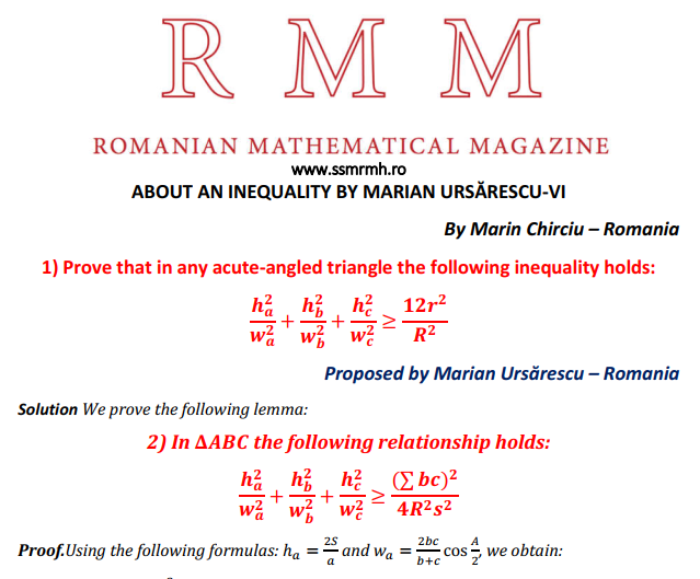 ABOUT AN INEQUALITY BY MARIAN URSĂRESCU-VI Posted on July 21, 2020 by ssmrmh Math Note by Marin Chirciu-Romania ABOUT AN INEQUALITY BY MARIAN URSARESCU-VI