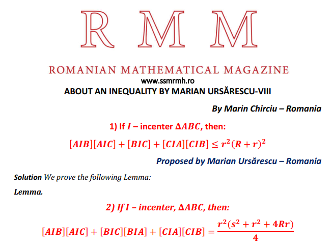 ABOUT AN INEQUALITY BY MARIAN URSARESCU-VIII Posted on July 22, 2020 by ssmrmh Math Note by Marin Chirciu-Romania ABOUT AN INEQUALITY BY MARIAN URSARESCU-VIII