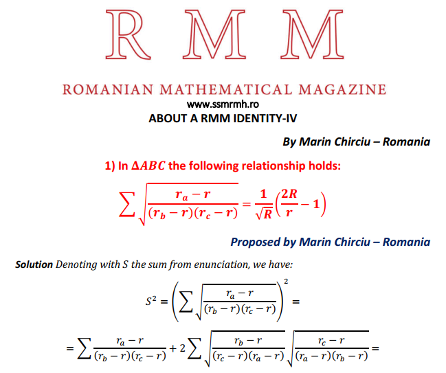 ABOUT A RMM IDENTITY-IV Posted on August 10, 2020 by ssmrmh Math Note by Marin Chirciu-Romania ABOUT A RMM IDENTITY-IV