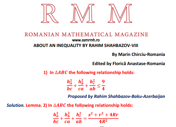 ABOUT AN INEQUALITY BY RAHIM SHAHBAZOV-VIII Posted on August 11, 2020 by ssmrmh Math Note by Marin Chirciu-Romania ABOUT AN INEQUALITY BY RAHIM SHAHBAZOV-VIII