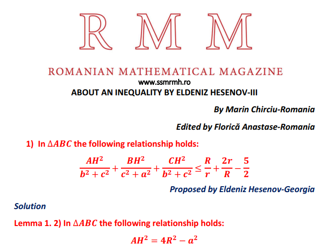 ABOUT AN INEQUALITY BY ELDENIZ HESENOV-III Posted on August 12, 2020 by ssmrmh Math Note by Marin Chirciu-Romania ABOUT AN INEQUALITY BY ELDENIZ HESENOV-III
