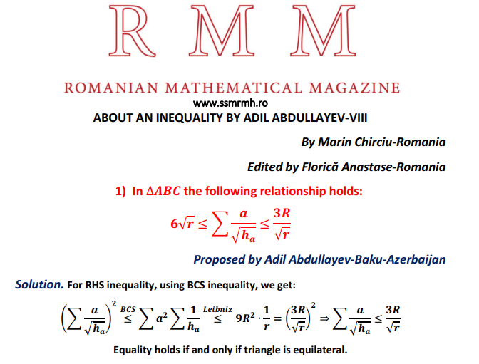 ABOUT AN INEQUALITY BY ADIL ABDULLAYEV-VIII Posted on August 15, 2020 by ssmrmh Math Note by Marin Chirciu-Romania ABOUT AN INEQUALITY BY ADIL ABDULLAYEV-VIII