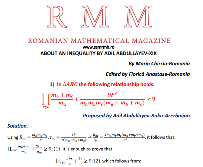 ABOUT AN INEQUALITY BY ADIL ABDULLAYEV-XIX Posted on September 27, 2020 by ssmrmh Math Note by Marin Chirciu-Romania ABOUT AN INEQUALITY BY ADIL ABDULLAYEV-XIX