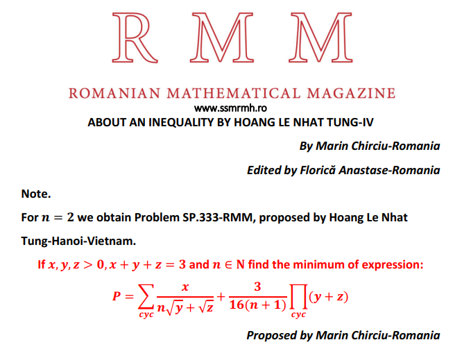 ABOUT AN INEQUALITY BY HOANG LE NHAT TUNG-IV Posted on September 29, 2020 by ssmrmh Math Note by Marin Chirciu-Romania ABOUT AN INEQUALITY BY HOANG LE NHAT TUNG-IV