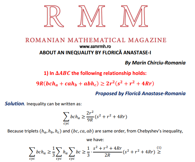 ABOUT AN INEQUALITY BY FLORICĂ ANASTASE-I Posted on October 16, 2020 by ssmrmh Math Note by Marin Chirciu-Romania ABOUT AN INEQUALITY BY FLORICĂ ANASTASE-I