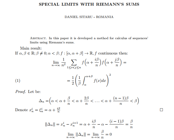 SPECIAL LIMITS WITH RIEMANN’S SUMS Posted on December 19, 2020 by ssmrmh Article by Daniel Sitaru-Romania SPECIAL LIMITS WITH RIEMANN’S SUMS