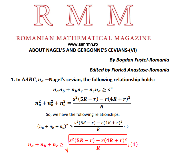 ABOUT NAGEL’S AND GERGONNE’S CEVIANS-(VI) Posted on December 29, 2020 by ssmrmh Article by Bogdan Fuștei-Romania ABOUT NAGEL’S AND GERGONNE’S CEVIANS-(VI)