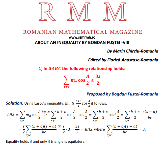 ABOUT AN INEQUALITY BY BOGDAN FUȘTEI-VIII Posted on January 31, 2021 by ssmrmh Math Note by Marin Chirciu-Romania ABOUT AN INEQUALITY BY BOGDAN FUȘTEI-VIII