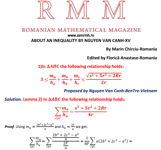 ABOUT AN INEQUALITY BY NGUYEN VAN CANH-XV Posted on March 28, 2021 by ssmrmh Math Note by Marin Chirciu-Romania ABOUT AN INEQUALITY BY NGUYEN VAN CANH-XV