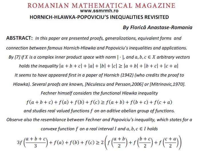 HORNICH-HLAWKA-POPOVICIU’S INEQUALITIES REVISITED Posted on April 9, 2021 by ssmrmh Article by Florică Anastase-Romania HORNICH-HLAWKA-POPOVICIU’S INEQUALITIES REVISITED
