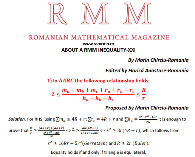 ABOUT A RMM INEQUALITY-XXI Posted on April 30, 2021 by ssmrmh Math Note by Marin Chirciu-Romania ABOUT A RMM INEQUALITY-XXI