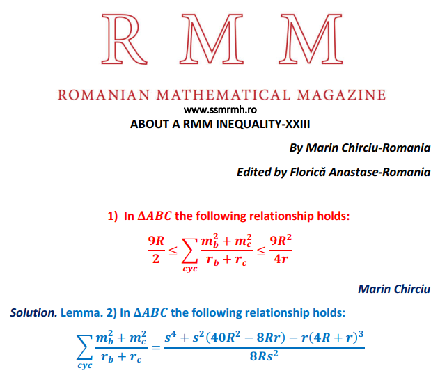 ABOUT A RMM INEQUALITY-XXIII Posted on June 5, 2021 by ssmrmh Math Note by Marin Chirciu-Romania,Edited by Florică Anastase-Romania ABOUT A RMM INEQUALITY-XXIII
