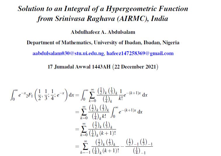 AN ADVANCED RAGHAVA’S INTEGRAL Posted on December 22, 2021 by ssmrmh Proposed by Srinivasa Raghava-AIRMC-India AN ADVANCED RAGHAVA’S INTEGRAL Solution by Abdulhafeez Ayinde-Ibadan-Nigeria