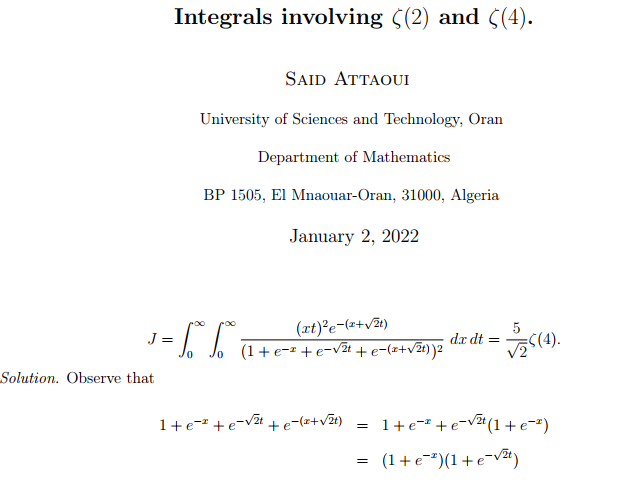 FEW AMAZING INTEGRALS BY SAID ATTAOUI Posted on January 2, 2022 by ssmrmh Math Note by Said Attaoui-Oran-Algerie FEW AMAZING INTEGRALS BY SAID ATTAOUI