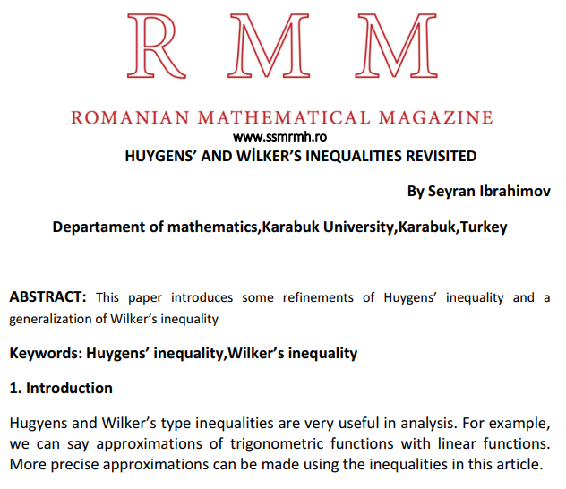HUYGENS’ AND WILKER’S INEQUALITIES REVISITED Posted on January 8, 2022January 8, 2022 by ssmrmh Article by Seyran Ibrahimov-Maasilli-Azerbaijan HUYGENS’ AND WILKER’S INEQUALITIES REVISITED