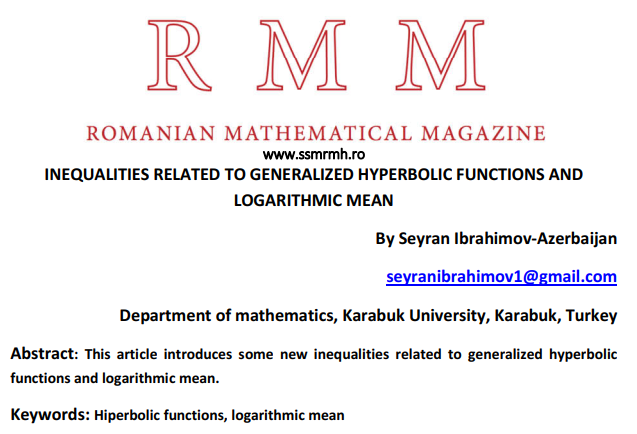 INEQUALITIES RELATED TO GENERALIZED HIPERBOLIC FUNCTIONS AND LOGARITHMIC MEAN Posted on February 9, 2022 by ssmrmh Article by Seyran Ibrahimov-Azerbaijan INEQUALITIES RELATED TO GENERALIZED HIPERBOLIC FUNCTIONS AND LOGARITHMIC MEAN