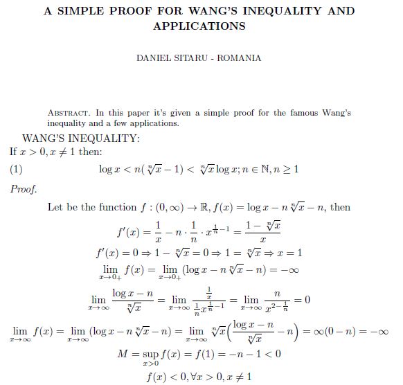 A SIMPLE PROOF FOR WANG’S INEQUALITY AND APPLICATIONS Posted on March 21, 2022 by ssmrmh Article by Daniel Sitaru-Romania A SIMPLE PROOF FOR WANG’S INEQUALITY AND APPLICATIONS