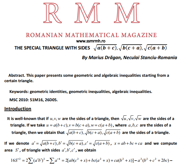 A SPECIAL TRIANGLE Posted on July 13, 2022 by ssmrmh Article by Marius Drăgan, Neculai Stanciu-Romania A SPECIAL TRIANGLE