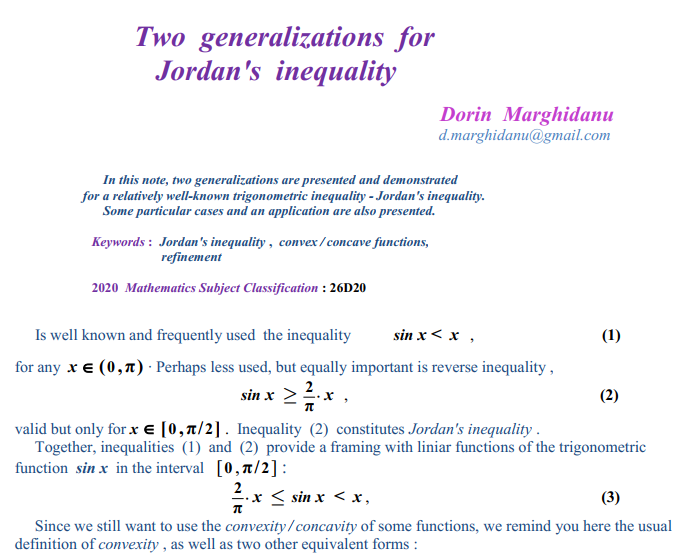 TWO GENERALIZATIONS FOR JORDAN’S INEQUALITY Posted on August 12, 2022August 12, 2022 by ssmrmh Article by Dorin Mărghidanu-Romania TWO GENERALIZATIONS FOR JORDAN’S INEQUALITY