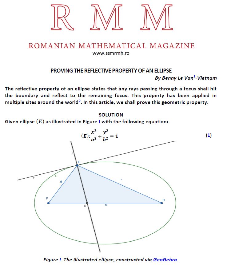 PROVING THE REFLECTIVE PROPERTY OF AN ELLIPSE Posted on February 10, 2023 by ssmrmh Article by Benny Le Van-Vietnam PROVING THE REFLECTIVE PROPERTY OF AN ELLIPSE